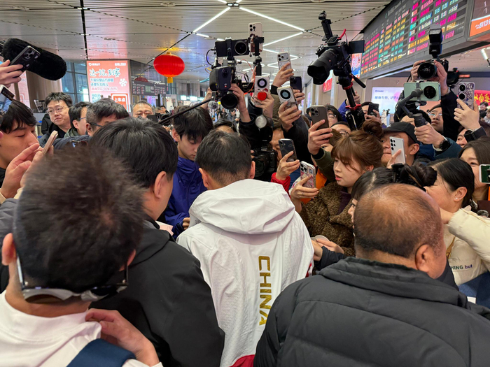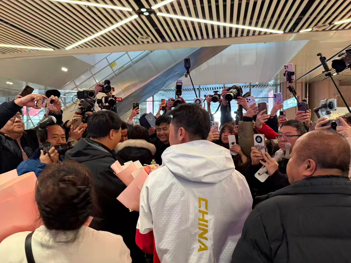 ✈️中国速滑名将,冬奥冠军@因为我叫宁忠岩_ 今日回到家乡黑龙江,接机现场人山人海,米兰冬奥会上,宁忠岩夺得1金2铜三枚奖牌。