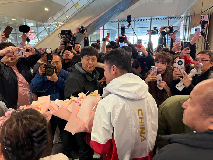 ✈️中国速滑名将,冬奥冠军@因为我叫宁忠岩_ 今日回到家乡黑龙江,接机现场人山人海,米兰冬奥会上,宁忠岩夺得1金2铜三枚奖牌。